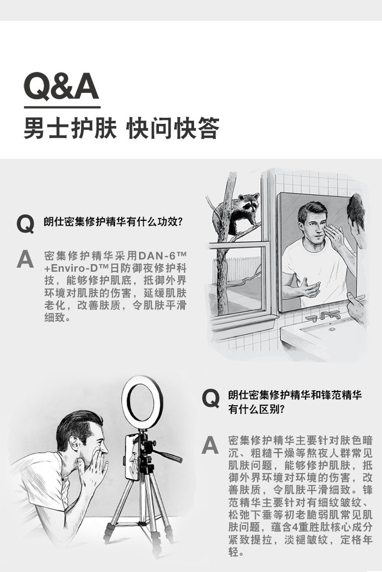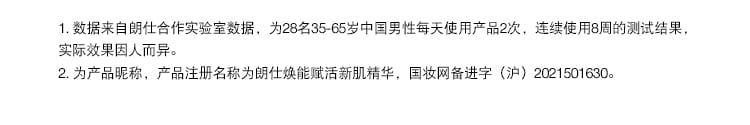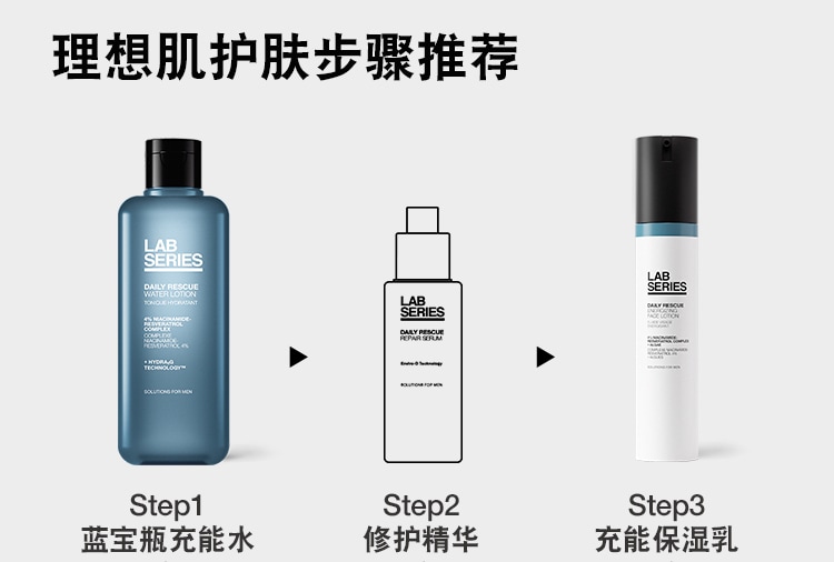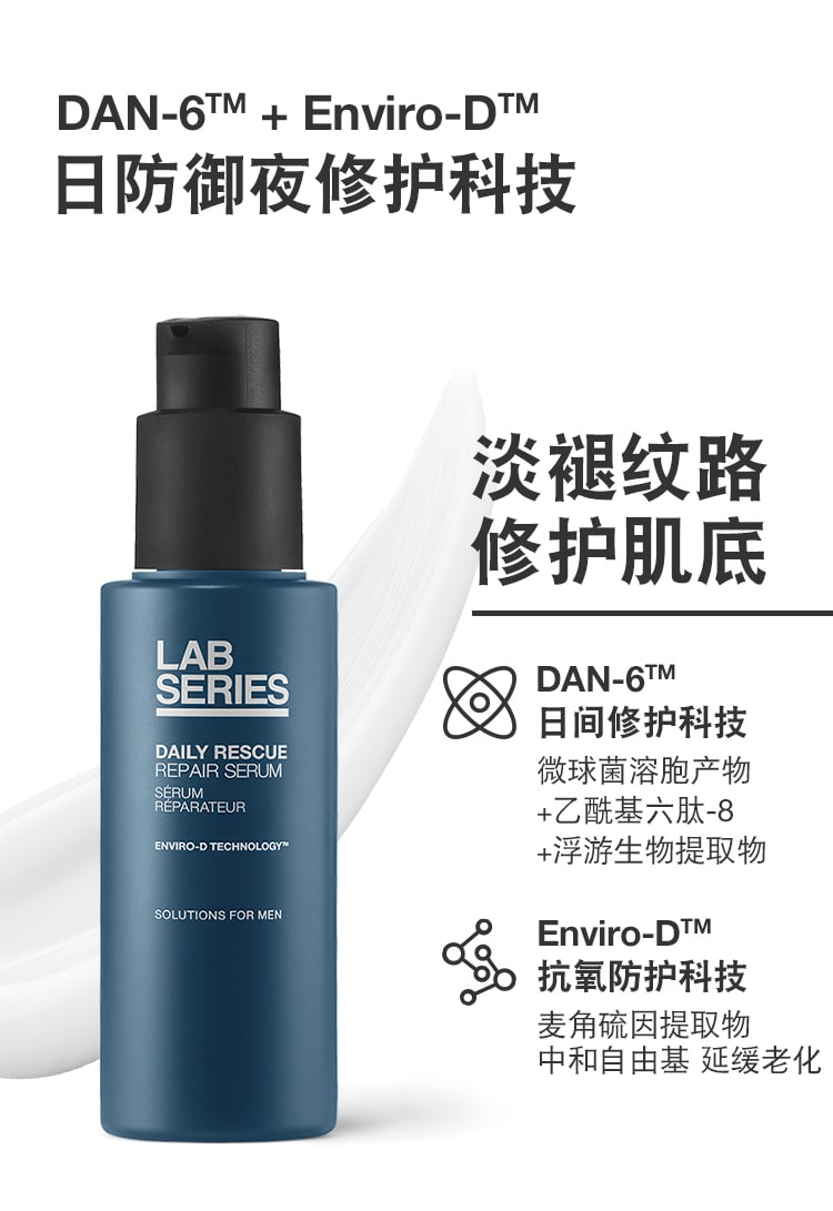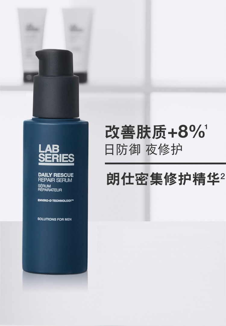 首页 / specialty care 朗仕焕能赋活新肌精华DAILY RESCUE REPAIR SERM 这款修护精华露能够修护当下和未来的皮肤状况。为肌肤竖起保护屏障抵御外界污染和皮肤老化的问题,修护老化痕迹。 加载中 保湿焕能系列 抵御并修护因肌肤自然老化和外界环境侵害导致的肌肤问题 淡化细纹和干纹 肌肤更平滑细腻+12%** 来自朗仕合作实验室数据,28名35-65岁中国男性,每日使用2次,连续使用8周的测试结果。实际使用效果因人而异。 成分配方Enviro-D™ 多重抗氧化复合成分,抵御因外界环境因素(如空气污染,蓝光,自由基)造成的肌肤老化问题。Exfoliox™(乙酰葡糖胺),加速皮肤表面堆积的老废角质剥脱,改善肤质。DAN-6™(微球菌溶胞产物+乙酰基六肽-8+浮游生物提取物),日夜修护并促进胶原新生,抚平岁月痕迹。 朗仕重视环境保护朗仕焕能赋活新肌精华的包装由 25% 以上环保再生材料制成。