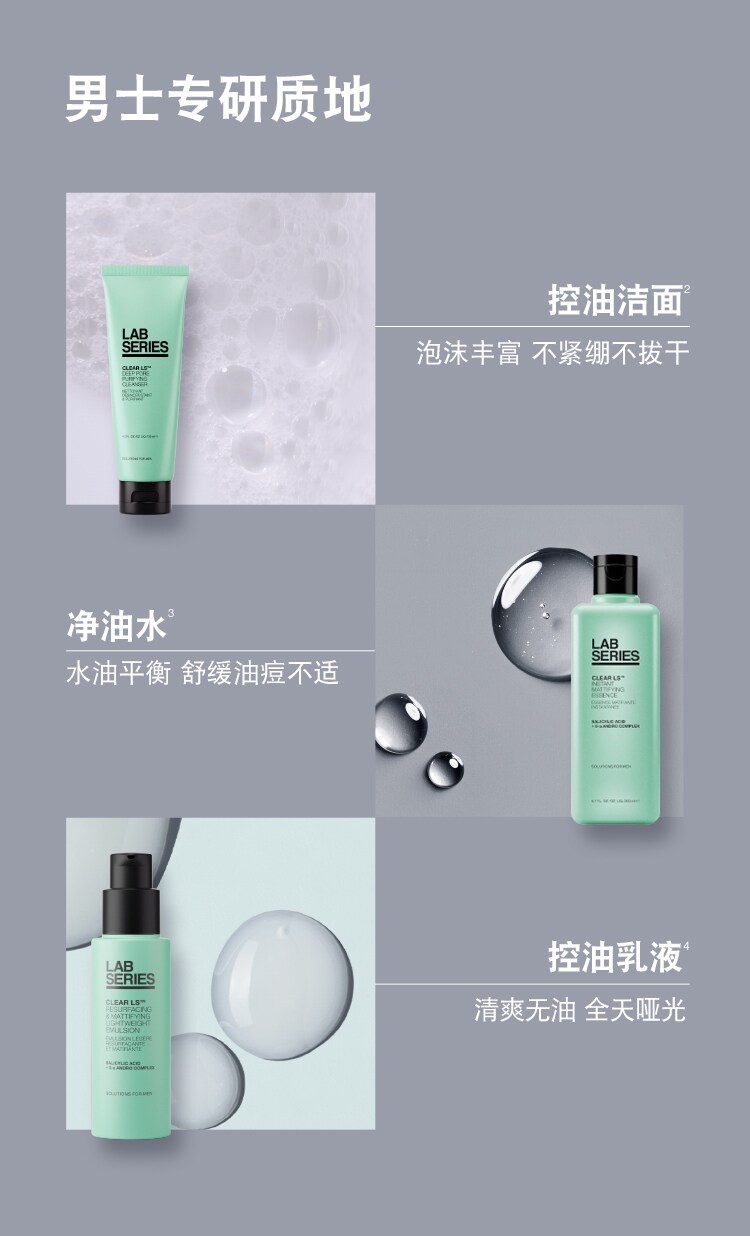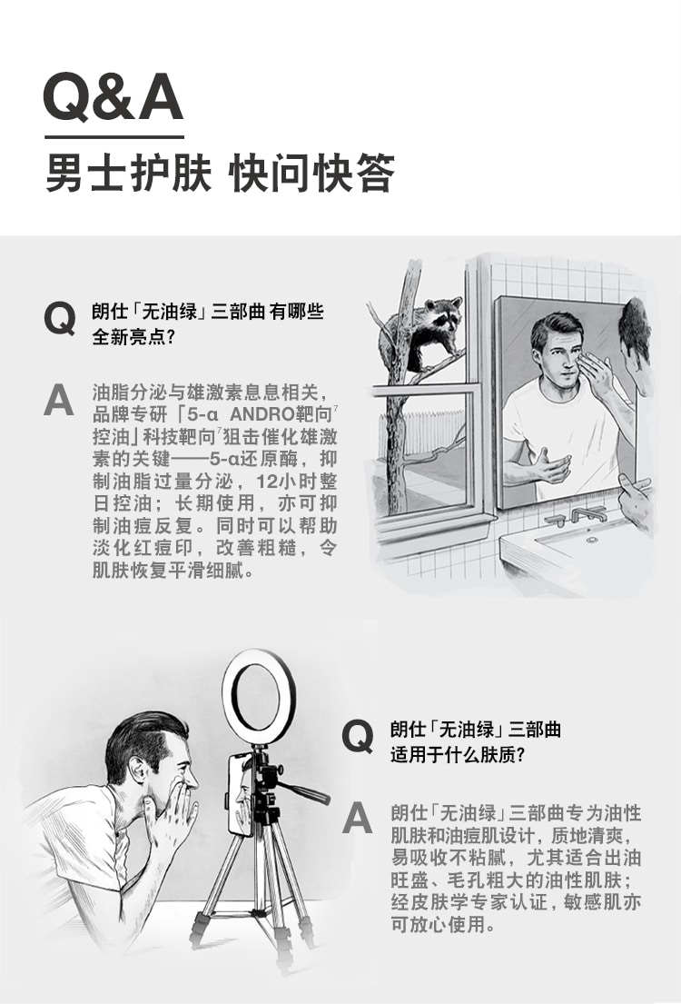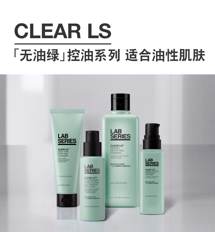 首页 / set 「无油绿」控油三部曲Clear LS 3 SET 加载中 「无油绿」控油系列 深层清油脂 毛孔超净爽 收敛细致毛孔,平滑肤质 12H硬控油光 净褪红痘印质 直击男士出油成因 油痘不反复 实验室结果 14H12H持久控油**指三部曲中的乳液测试结果。数据来自朗仕实验室,为16位24-71岁的男士单次使用产品后的测试结果,实际效果因人而异。-41%-41%祛红痘印**数据来自朗仕合作实验室,为25位22-65岁男士使用产品后150分钟的测试结果,实际效果因人而异。-14%-14%细致毛孔**数据来自朗仕实验室,为18位24-72岁的男士单次使用产品后的测试结果,实际效果因人而异。 成分配方专研「5-α ANDRO靶向净油」科技,抑制油脂过量分泌。水杨酸,疏通毛孔 改善粗糙。胀果甘草根植萃+红没药醇,痘印橡皮擦加速褪红痘印。 朗仕重视环境保护朗仕控油净透收敛水的包装由 27% 以上环保再生材料制成。
