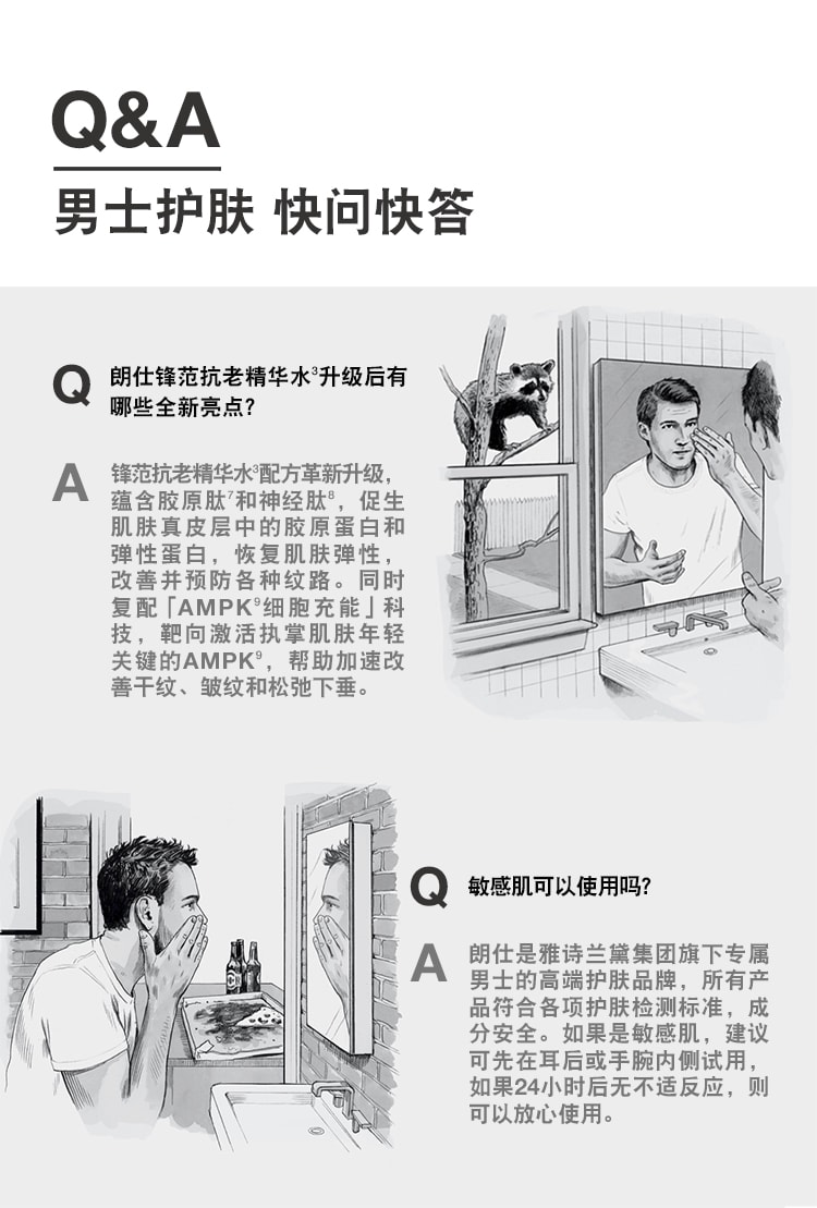 首页 / Water Lotion 朗仕锋范抗皱紧致精华水ANTI-AGE MAX LS LOTION 加载中 锋范紧致系列 密集保湿,令肌肤持久水润 即刻焕活肌肤,改善肤质 连续使用,提亮肤色 改善细纹、干纹 成分配方焕活再生科技,密集保湿,提升细胞再生力,令肌肤重焕光彩,淡褪细纹、干纹。酵母多糖,焕亮肌肤,改善肤色。透明质酸协同藻提取物,补水保湿,强韧肌肤屏障,帮助抵御外部环境侵害。乙酰壳糖胺,平滑肌肤,改善肤质。绿茶提取物,卓效抗氧化,舒缓维稳肌肤。 朗仕重视环境保护。朗仕锋范抗皱紧致精华水的包装由27%以上环保再生材料制成。